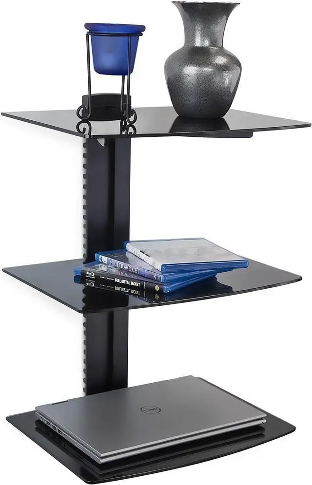 HEAVY-DUTY and DURABLE design can support up to 22 lbs. The black tinted tempered glass shelves are approximately 1/4 inch thick.
