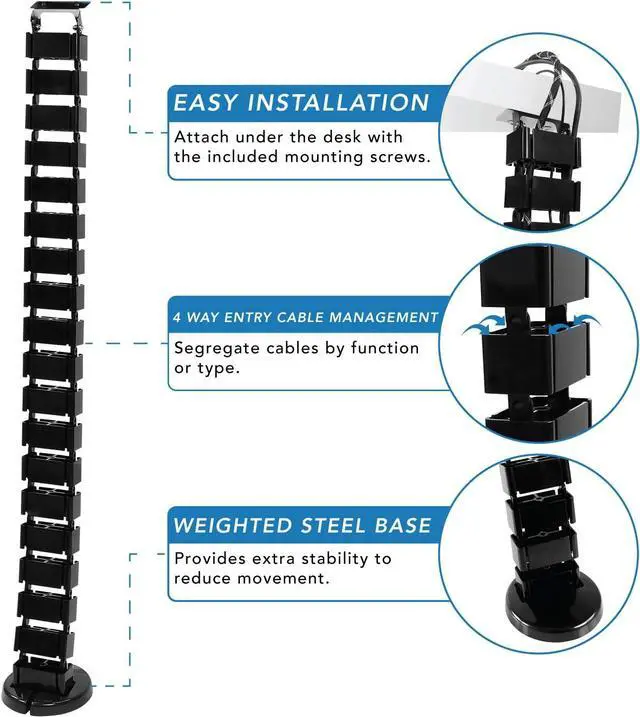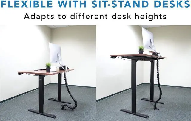 EASY INSTALLATION: Simply secure the connection plate to the bottom of your desk and position the weighted base on the floor. Change the length of the spine (up to 50 inches) based on the distance between floor and the desktop. Modular pieces easily snap together or can be removed. Excess length coils onto itself, making it ideal for height adjustable sit stand desks.