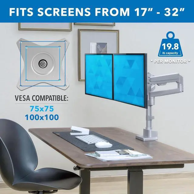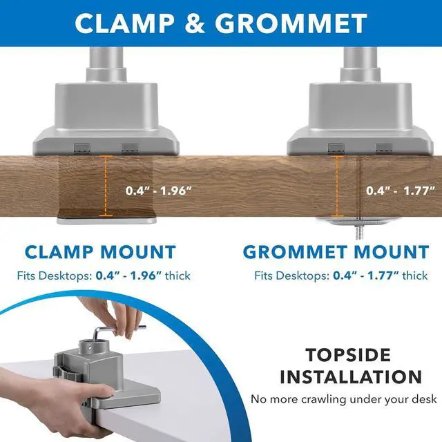Easy Installation and Sturdy Design: The topside installation with a clamp or grommet base makes setup quick and easy. The sturdy design supports monitors from 19 to 32 inches, each arm holding up to 19.8 pounds, and is compatible with VESA 75x75 and 100x100 patterns.