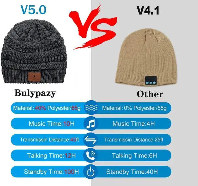 Upgraded Bluetooth V 5.0 TechBluetooth beanie V 5.0 version connection is more reliable, produces higher quality sound, and provides more efficient battery usage. The bluetooth hat offers the stablest connection, fast, and easy to sync to any Bluetooth-enabled device, up to 45 feet. Also longer battery life, better sound quality than Version 4.2.