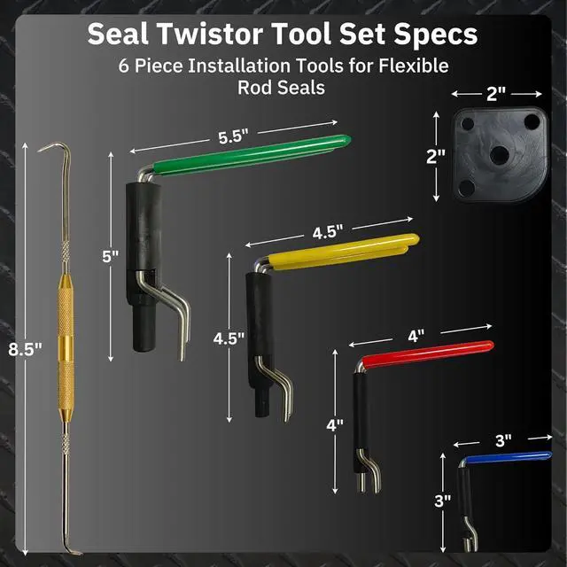 Includes: 4 Sizes Seal Twistors Tools, 1 Surface Mountable Twistor Handle Block, and 1 Two Sided Seal Pick & Hook Multitool.