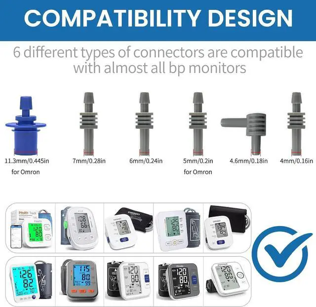 Universal Compatibility: 6 different types of connectors(4mm/ 0.16 in, 4.6 mm/ 0.18 in, 5mm/ 0.2 in, 6mm/ 0.24 in, 7mm/ 0.28 in, 11.3 mm/ 0.445 ) are compatible with almost all blood pressure monitors.
