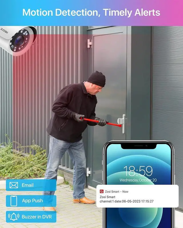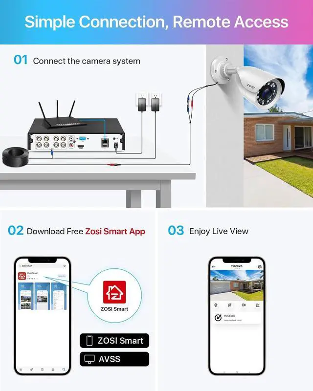 (3). [ Local or Remote Access, Playback Anytime & Anywhere ] __ View and control your security system locally by connecting the system to a monitor without internet, or via free ZOSI Client software on tablet, PC, or via Smartphone APP (ZOSI Smart ) on mobile devices remotely. You can also playback significant evidence or funny videos records by searching different days, hours or minutes.