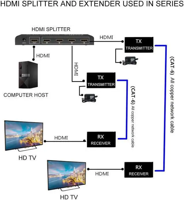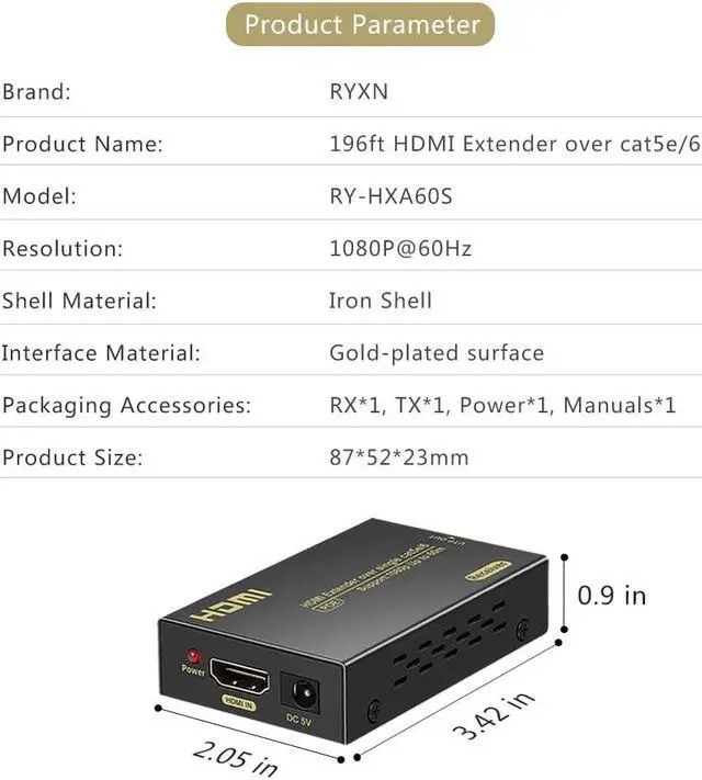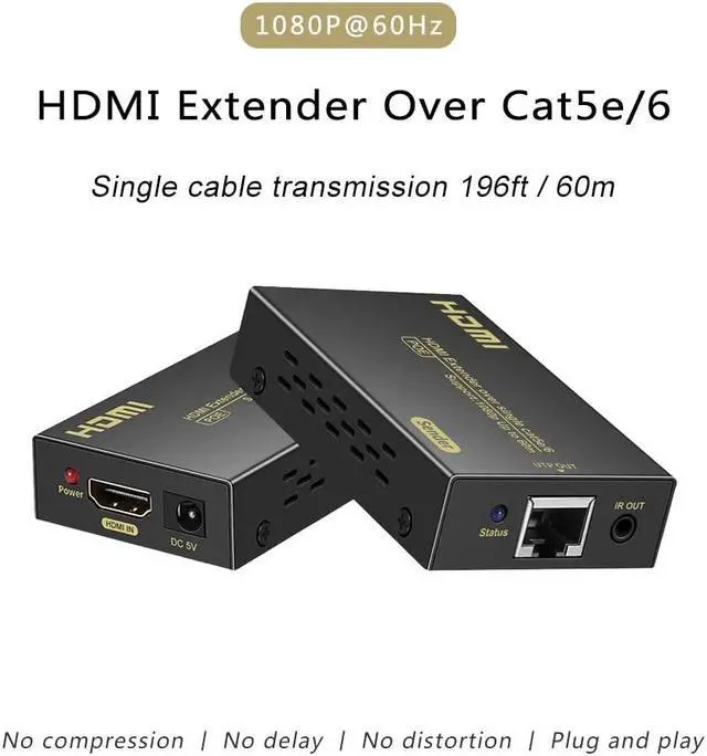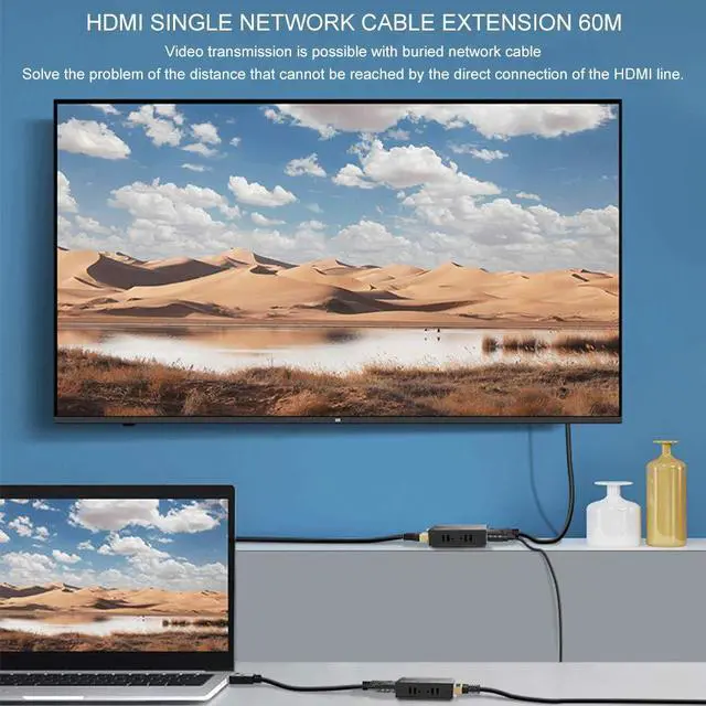 HDMI Extender 196ftUse Cat5e/Cat6 network cable to connect HDMI source devices (PC, Blu-ray player, Firestick, etc. ) to the transmitter, and transmit the HDMI signal to the receiver via a single network cable. The maximum distance can reach 196ft/ 60m. Finally, connect the HDMI signal at the receiving end to a high-definition television or high-definition display device.