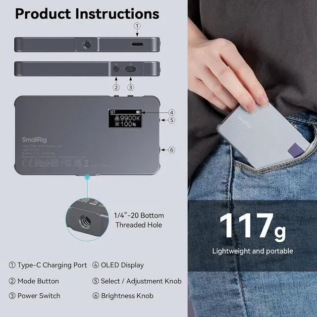 Universal and LightweightAt just 108*60*11mm and weighing 117g, the RGB camera light is easy to carry with one hand and is a must-have item in your camera bag. It features a standard 1/4 screw for tripod with cold shoe mount for camera or DSLR camera, making it compatible with Nikon, Sony, Canon, Fuji, Panasonic, and more.