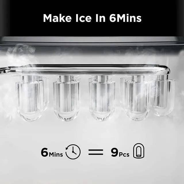 FAST ICE MAKER: The Silonn ice maker only takes 6 minutes to make 9 bullet-shaped ice cubes. Fill 2L of water into the water tank, maximum ice capacity can reach 26 pounds in 24 hours