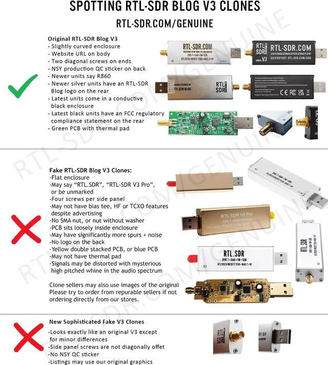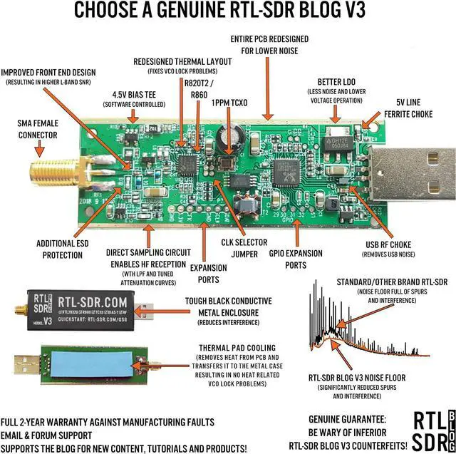 Several improvements over other brands including use of the R860 tuner, improved component tolerances, a 1 PPM temperature compensated oscillator (TCXO), SMA F connector, aluminum shielded case with thermal pad for passive cooling, and an activatable bias tee circuit.