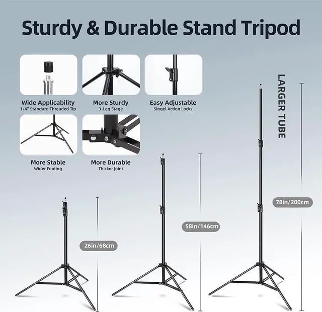 Rotatable Head & Adjustable Stand: The light stand tripod height adjustable from 26 to 79 inch/66cm to 200cm, 3-section column legs, made of aluminum alloy more sturdy and stable. Angle can be 210°adjustable lamp holder, which can suit for different perfect shooting with 1/4-inch Standard Screw Thread Tip. And with extra-long 8.5F t/250cm cable, greater range of movement convenient for shooting photography.