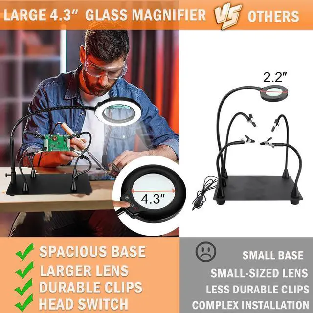 Hands-Free with 10X Magnifying Lamp: Take your precision work with our Helping Hand, featuring a larger 4.3 " real glass magnifying light. This magnification capability allows for detailed examination and desoldering, making it suitable for intricate electronic repairs, jewelry making, and other fine craftsmanship. Whether you choose to use the clamp or the base, this magnifier is an indispensable addition to your workspace.