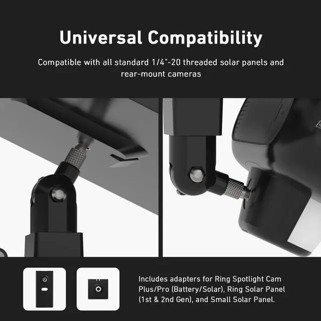 With standard 1/4 inch-20 screw connectors, this universal mount is designed to work with most outdoor cameras and solar panels, including Eufy, Arlo, Wyze, and more. It also comes with adapters for mounting Ring solar panels and cams.