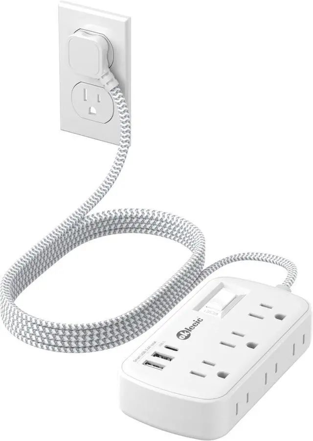 15FT Long Extension Cord & 45° Right Angle Flat Plug 15 ft flat power cord allows it to reach anywhere in the room without tangling and being more flexible. Braided extension cord is not easy to deform, durable and safer than other powerstrip. The slim 0.6 inch plug and 45° right Angle design allow this flat plug power outlet to be easily installed in narrow gaps behind furniture without obstructing the use of other power strips.