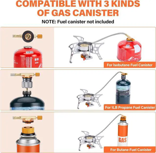 Compatiable with 3 Kinds of Gas Canister: We provide a butane adapter and a 1LB Propane Tank Adapter, so our propane camp stove is not only compatible with butane camping fuel gas canister, 7/16 threaded monobutane/butane-propane blend tank (EN 417), but also compatible with 1lb propane small tank.
