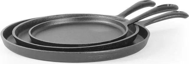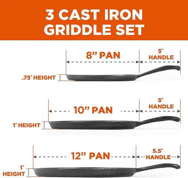 3 SIZES: Get more for your money with this COMMERCIAL CHEF 3-piece cast iron griddle set. Enjoy an 8-inch, 10-inch and 12-inch pre-seasoned round cast iron griddle at a budget-friendly price! Hang easily in your modern kitchen with openings on the end of each handle. Use on a stove top, in an oven, broiler or even outdoors at a campfire!