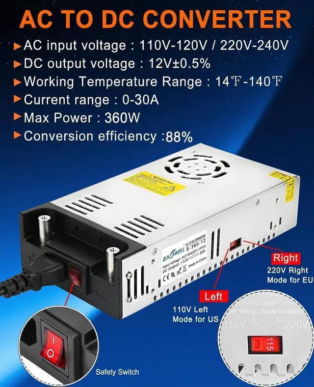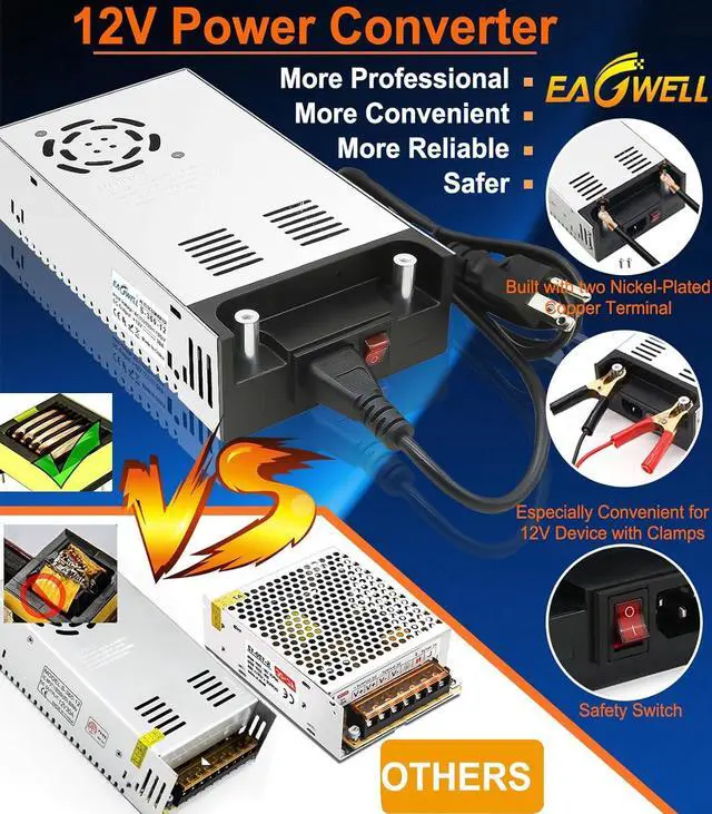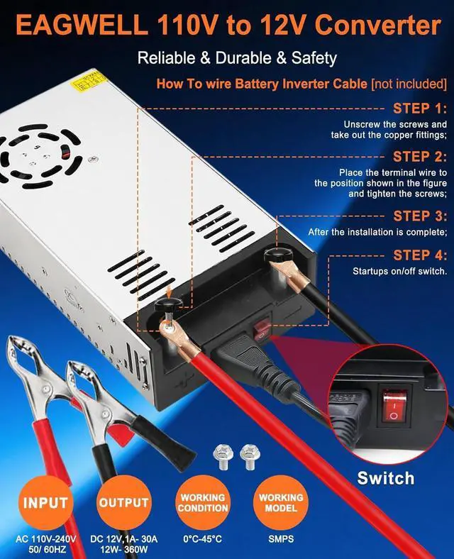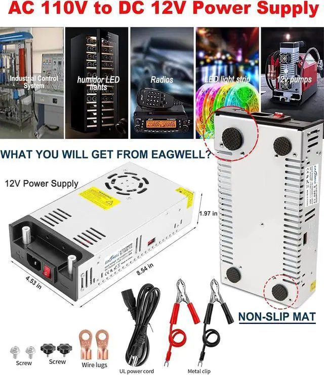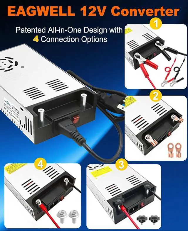 Plug-and-Play Setup with All-Inclusive Kit. Eagwell ac to dc Converter Includes UL-listed power cord, 12v power supply 600w, cigarette lighter socket, wire lugs, metal clips, and screwseverything you need for clamp-style device connections. Dual wiring options (direct wire + terminal clamps) fit DIY projects, RVs, or industrial setups. No extra tools required