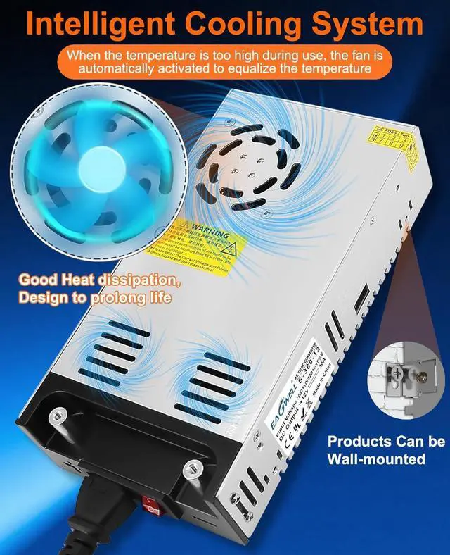 5-Layer Safety Protection. Eagwell 12V 50A 600W Power Supply Converter Overload, overvoltage, short circuit, overheat, and leakage protectionbuilt into the heavy-duty copper-nickel terminals. Built-in EMI filter reduces interference for clean power. UL, CE, RoHS certified for worry-free use. Ideal for sensitive equipment (CCTV, medical devices) and harsh environments (boats, workshops)