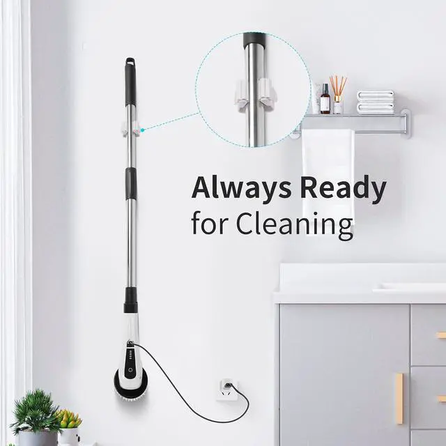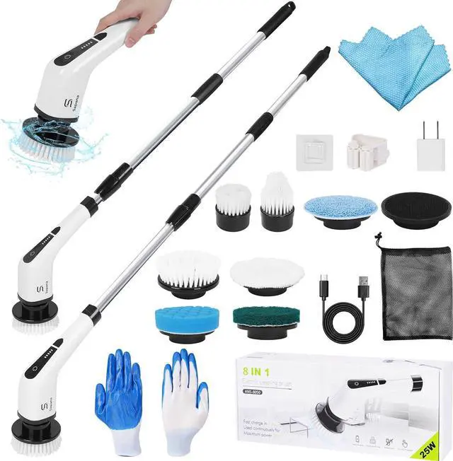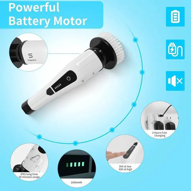 Powerful Electric Scrubber for Cleaning A high-performance motor with a 2500mAh lithium battery, delivering a deep clean with a high rotational speed of 400 RPM. This electric cleaning brush outperforms average spin motors with two adjustable speed modes, perfect for all your cleaning needs. Includes a set of gloves and a holder for convenient use.