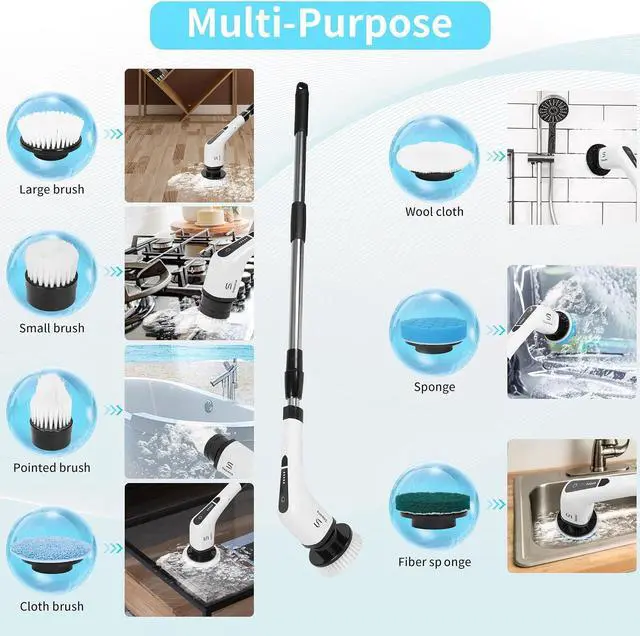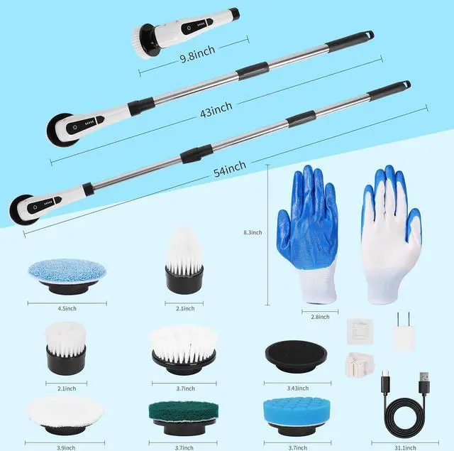 SAPANA IPX5 electric scrubber comes with an adopter and 8 replacement brush heads for different scenarios to remove tough stains, The bathroom scrubber Electric has a 23.33 mm diameter and length of 12 inches without rod, 43.33 and 54 with adjustable rods, Floor scrubber provide 90 minutes of long-term work with one single charge.