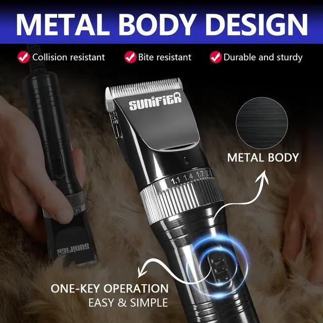Thick Coats: Our Professional Dog Clippers are specially crafted to tackle thick coats effortlessly. The sturdy Aluminum Alloy Body ensures durability and longevity, making these pet clippers your go-to grooming tool for years to come. Say goodbye to struggles and tangles, as these dog trimmers reduce the possibility of pulling hair, providing a smoother and faster grooming experience