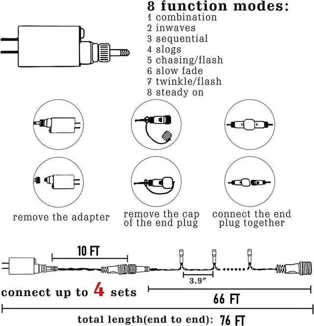 8 Lighting Modes: The string lights feature 8 different lighting modes: combination, slow glow, wave, sequential, chasing/flash, slow fade, twinkle/flash, and steady on. Simply press the button on the transformer to select your preferred mode.