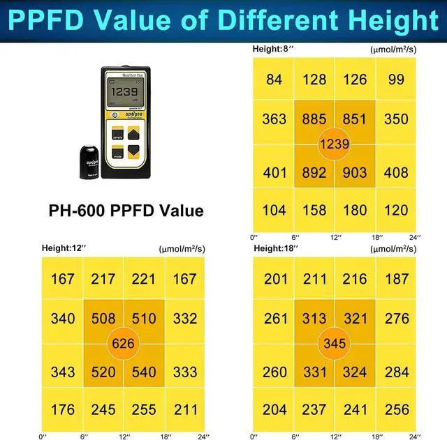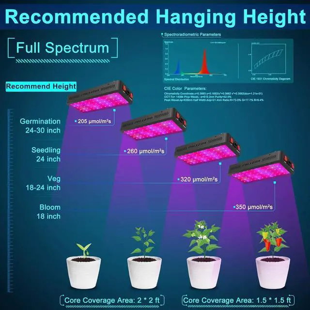 COMPARE TO HPS/MH- Compared to MH / HPS lamps, this 600w light with SMD led chips generates less heat, more energy saving and lower electricity bills and more comprehensive light spectrum. The grow light compares to traditional 600W HPS/MH while consuming only 100W! More effective coverage area than any reflector series lights. Perfect fit for a 2x2ft growing area at 24" height. The difference of us is that we use double cooling fans. which can most extend the light life.