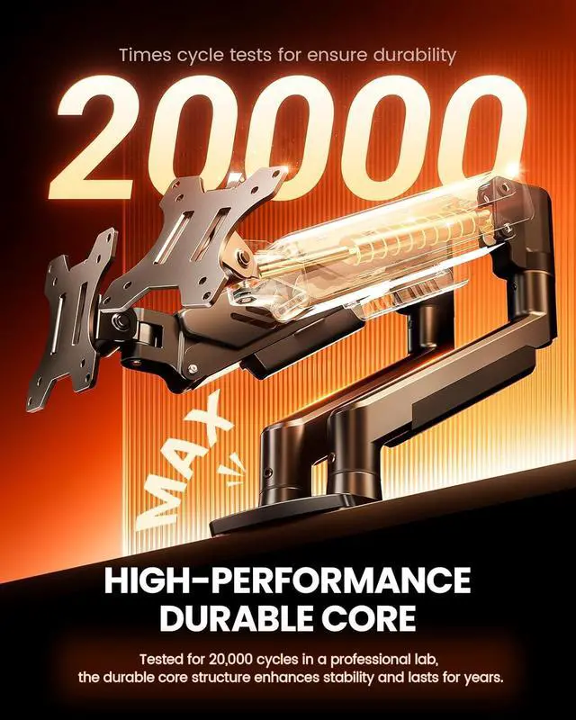 Built to Last: This dual monitor stand is engineered for long-term stability with an upgraded VESA head with 50% smaller gap and tighter-fitting VESA panel. These enhancements provide added support, to make sure your monitor stays securely mounted. Tested for over 20, 000 cycles, the premium core offers smooth and reliable movement, ensuring strong performance for years of use.