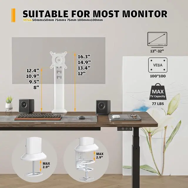 monitor desk mount The single monitor desk arm stand fits for most flat or curved computer screens up to 32", holds up to 77lbs, compatible with VESA pattern 75x75mm and 100x100mm