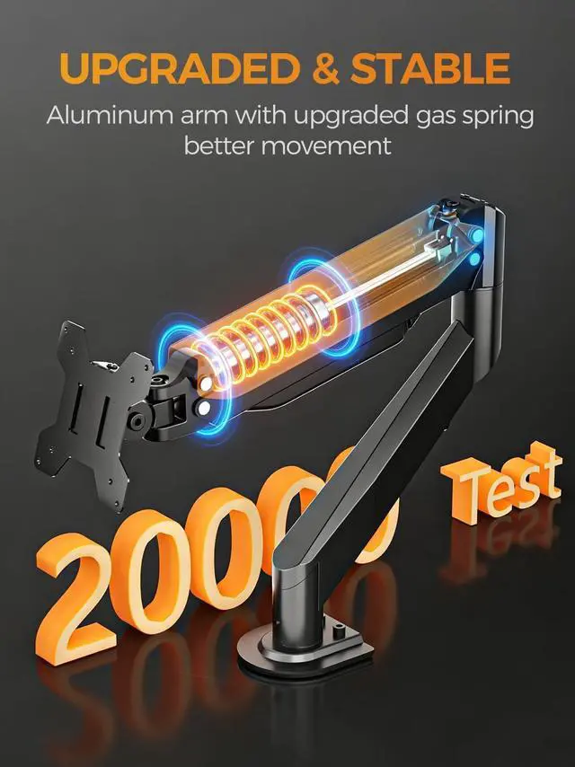 Gas Spring Arm Design - Our computer monitor mounts undergo rigorous testing to ensure durability and longevity, validated by over 20, 000 cycles of testing. The monitor arm can extend up to 21.65 " long. The height can be adjusted with the gas spring arm, maximum height of 18.7 inches.