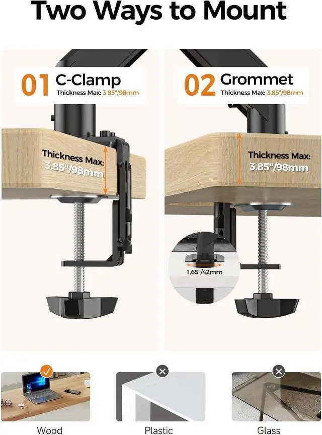 Two install options - C-clamp and optional grommet base (fits desk up to 3.85 " thickness) save your valuable desk space, hole