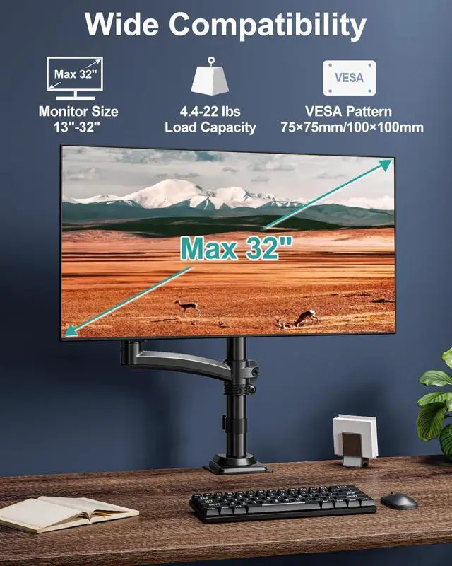Wide Compatibility - The single arm monitor mount can hold screens up to 22 lbs and fits most 13 inch to 32 inch displays using 75x75mm or 100x100mm VESA pattern, but not compatible with 1000R/1500R/1800R curved screens. This articulating monitor mount features a pneumatic tension design, ensuring smooth adjustments and long-lasting stability for your monitor. Before purchasing, please ensure your monitors weight, VESA pattern, and screen size are compatible.