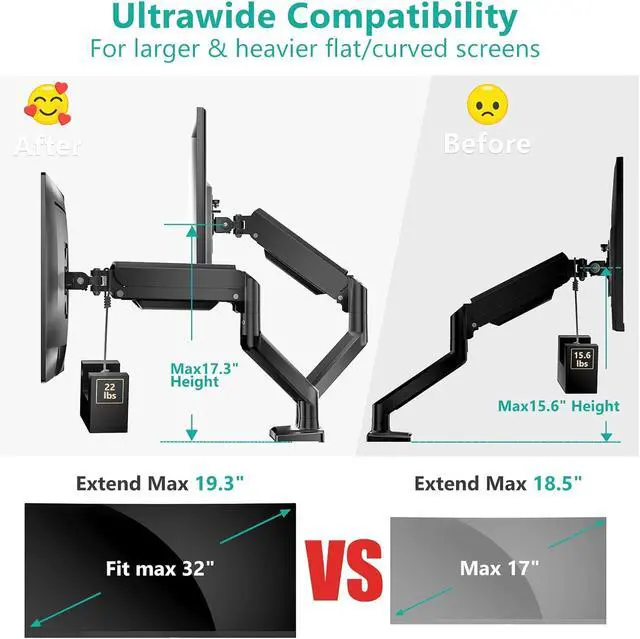 Universal Compatibility: WALI dual monitor stand is expertly engineered to support most flat and curved LCD/LED screens ranging from 17" to 32". With a robust weight capacity of up to 22 lbs and for 75x75mm and 100x100mm mounting holes