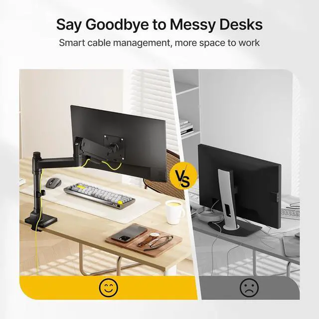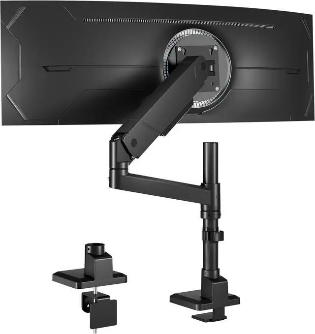 Clear Desktop Space: monTEK ultrawide monitor arm features a compact, low-profile base and elevated arm design, lifting your screen off the surface to free up valuable desk space. The single monitor arm also features integrated cable management, keeping power lines hidden and untangled, for a workspace that stays sleek, spacious, and clutter-free.