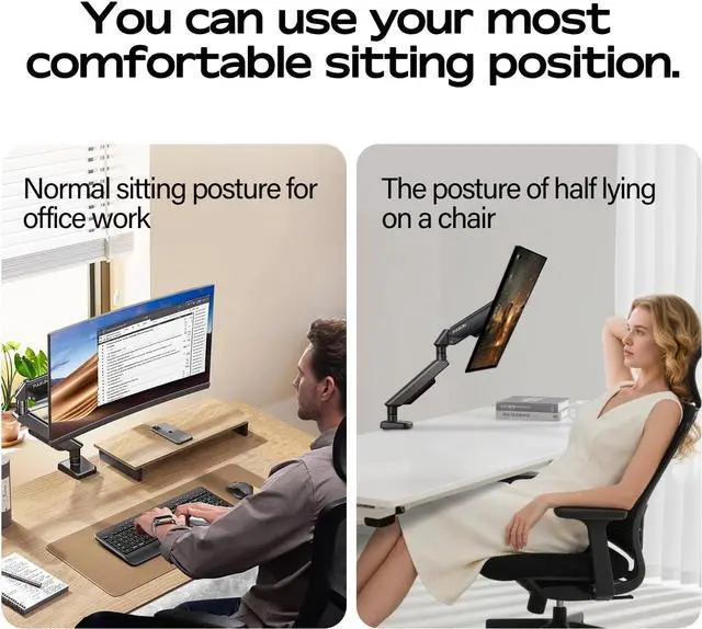 Flexible AdjustmentTilt (+90° to -45°), swivel (180°), and rotate (360°) your screen effortlessly. Ultrawide montior arm with 17.3 " height adjustment and 20.5 " extension range, it adapts to standing desks, gaming setups, or shared workstationsMeets optimal viewing comfort, work smarter and feel better every day