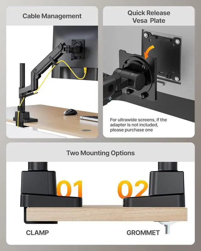 Easy InstallationThis mount supports two installation methods: C-clamp and grommet. The quick-release VESA plate makes installation effortless, while clearly labeled components help ensure a smooth assembly process.