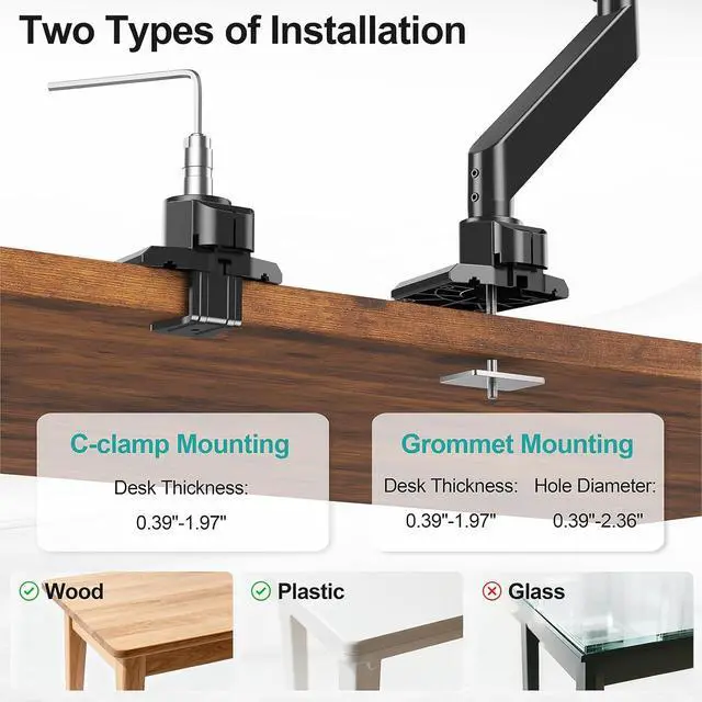 2 Mounting Options - This ultrawide monitor arm works on desks from 0.39 " to 2.97 " thick, you can choose clamp mounting or grommet mounting depending on the desk situation. We provide all the accessories needed for installation and adjustment, as well as a detailed instruction manual for easier installation, ensuring a hassle-free using experience.