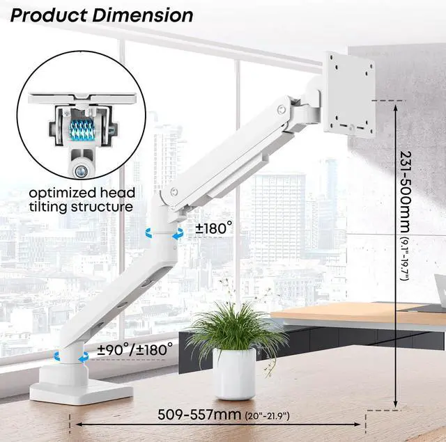 • Full Motion Design: This monitor arm features 50° tilt up and 20° tilt down, 180° swivel, 360° rotation and 20" height range for superb flexibility, allowing you to place screen in the best view or elevate your monitor to relieve neck and back strain and optimizes desk space