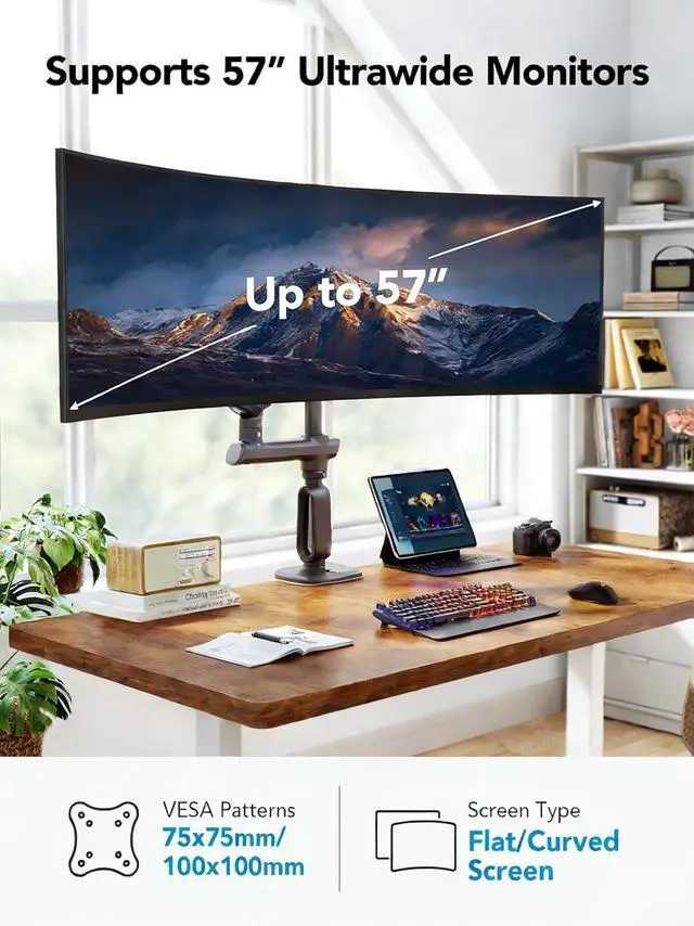 Ultrawide Gaming Screens: The heavy-duty monitor arm is designed to support 17" 57" flat and curved monitors with 75x75mm or 100x100mm VESA mounting patterns. The heavy-duty C-clamps or grommet mounting attach to desks ranging from 0.8 " 3.5 " thick, providing a strong, sturdy grip that keeps your monitor securely in place.