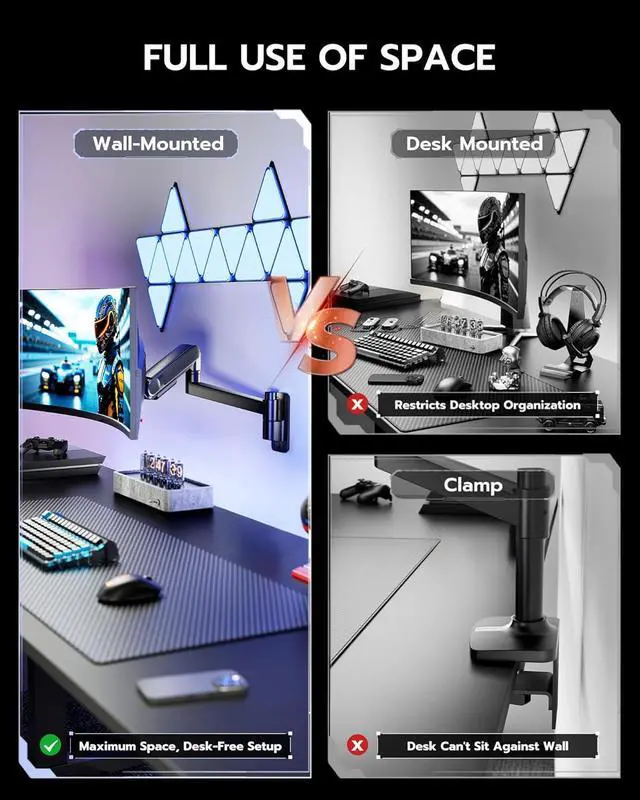 [Heavy Duty for Ultrawide Monitors] This premium wall mount monitor arm is engineered for oversized ultrawide screens up to 57 inches, including curved gaming monitors. With an exceptional weight capacity of 60 lbs, it ensures rock-solid support for heavy displays, making it ideal for professional workstations and immersive gaming setups.
