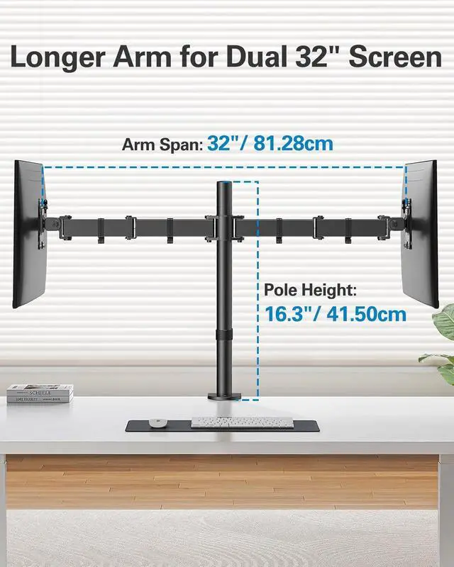 Maximize Desk Space: Raising monitors above your desktop can free up valuable space for other office essentials including your keyboard and mouse. The monitor arms for 2 monitors also features cable management clips to neatly route wires along the arms and pole for a clean and professional look.