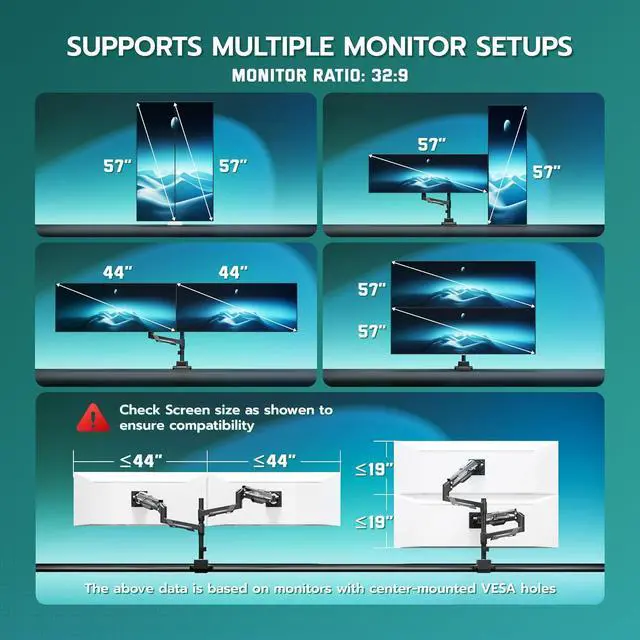 Born for Ultrawide Screens Ultrawide monitor arm made with high-quality aluminum, featuring enhanced tilting structure and gas springs, effortlessly hold flat screen up to 59.4 lbs & curved up to 48.4 lbs each arm, VESA patterns include 75x75, 100x100, 200x100, 200x200mm. Compatible with the Samsung Odyssey G9, LG, and other ultrawide monitors