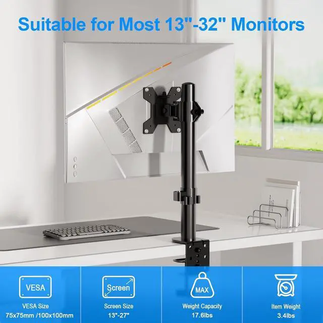 Wide CompatibilityOur single monitor stand supports most 13-27" monitors with VESA mounting patterns 75x75mm or 100x100mm. The maximum weight capacity of this product is approximately 17.6 lbs (8KG). Please check the VESA pattern and weight of the monitor before purchase.