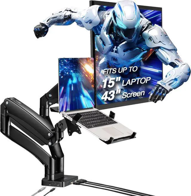 AVLT Dual 17-43" Monitor Arm Desk Mount with 15" Laptop Tray and USB-C Docking Station, HDMI 4K60Hz, USB-A 5Gbps, Ethernet, 100W PD, Fits Two Flat/Curved Monitor - Black