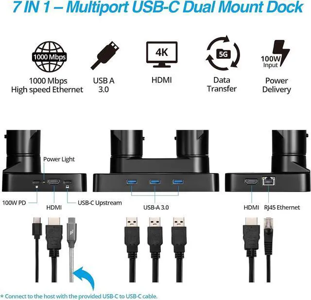 7 in 1 Docking Station Base - The monitor base doubles as a 7-port docking station, featuring 3x USB-A 3.0 ports (5Gbps), 2x HDMI ports (MST), 1x RJ45 Ethernet port (1Gbps), and 1x 100W PD Input port. Must use a supported Full-functioned USB-C 3.1 Gen 2 Port (or above) (must support transferring data, audio, video, and power. )