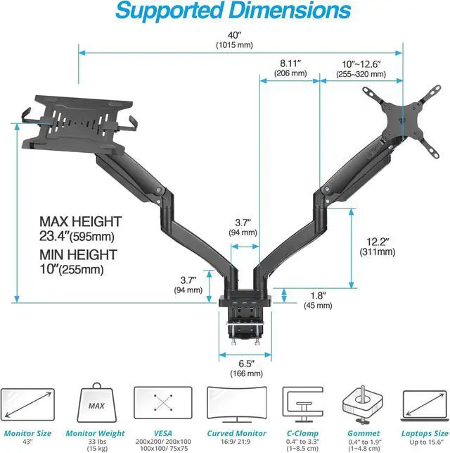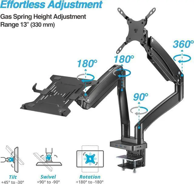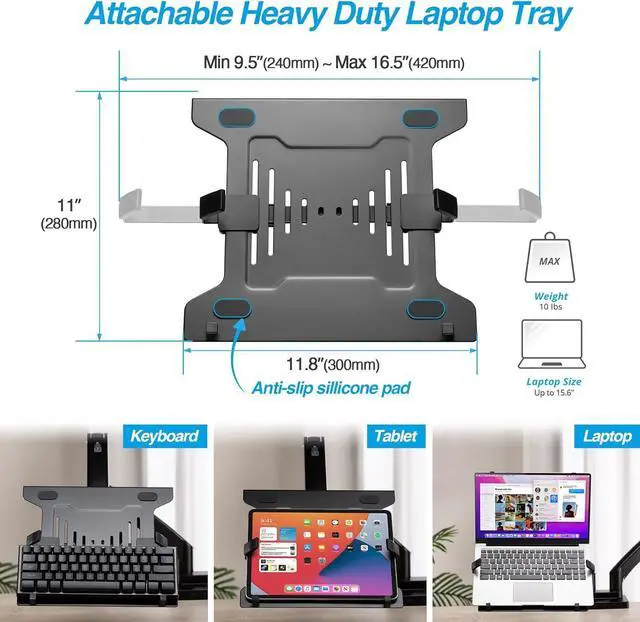 • Attachable Laptop Tray - Versatile and adaptable. Use either as a dual monitor mount, or as a single monitor mount with a laptop holder to accommodate your laptop, tablet, or keyboard, providing you with optimal flexibility and functionality.