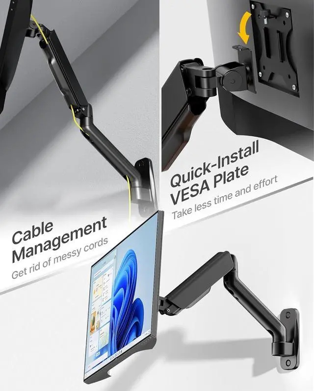 Maximize Your Desk SpaceMount your monitor to the wall and instantly free up your valuable desk space. The monitor mount has a classic look that fits in any environment, while the integrated cable management system keeps wires organized and your workspace neat and tidy. Whether you' re working, watching TV, monitoring or live streaming, this computer monitor wall mount brings both style and functionality to your setup