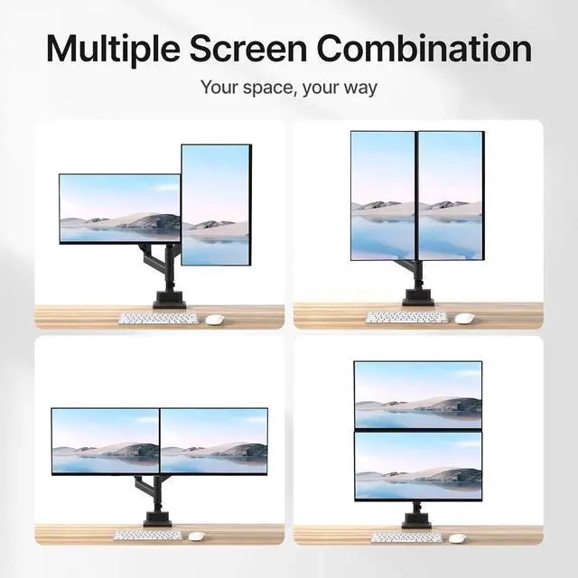 Flexible Use: This dual monitor arm works with most flat or curved screens sized 17" to 35". It has a max weight capacity of 35.27 lbs for steady performance, meeting VESA 75x75mm and 100x100mm standards. Perfect for office workstations, home setups, gaming rigs, this dual monitor mount fits diverse uses reliably.