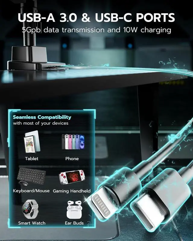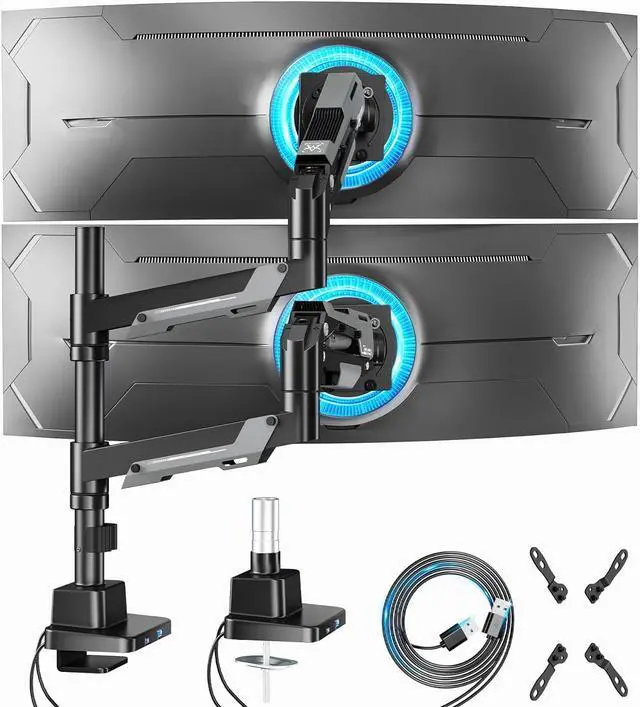 Save Your DesktopBy mounting your two monitors on the arms, this ultrawide monitor arm can free up 50% valuable desktop space for you. The built-in cable management system neatly hides cables and cords out of sight, creating a cleaner and more organized workspace. What' s more, the two integrated USB ports can provide convenient charging options for your phone, watch, tablet, laptop, and headphones at any time