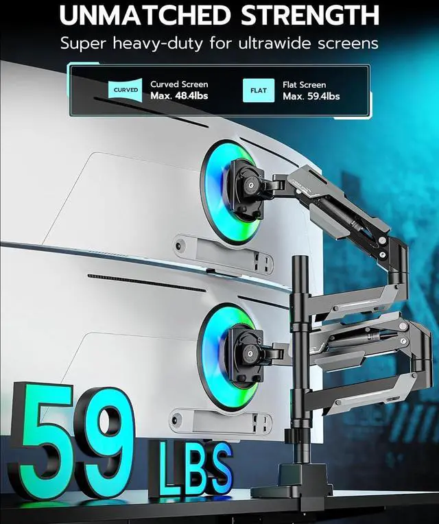 Born for Ultrawide ScreensDesigned for ultrawide heavy duty computer monitors, this dual stacked monitor mount supports flat and curved screens up to 57 inches per arm, holding flat monitors up to 59 lbs and curved monitor up to 48 lbs. Compatible with the Samsung Odyssey G9, LG, and other 49 " and 57 " ultrawide monitors, this dual screen monitor includes VESA mount adapters fitting 75x75 mm, 100x100 mm, 100x200 mm, 200x100 mm and 200x200 mm