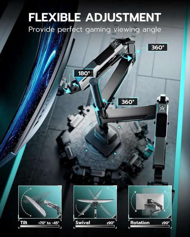 Flexible AdjustabilityThis dual monitor mount allows for a wide range of movement, including +70 ° to -45 ° tilt, +90 ° to -90 ° swivel, 360 °rotation, providing an optimal ergonomic posture and relieving strain on the spine, neck, and shoulders. Fearturing the maximum height of 25.8 " and maximum arm extension of 29.7 ", the double monitor mount allows for various screen stacking ways, providing a comfortable experience for gaming or viewing