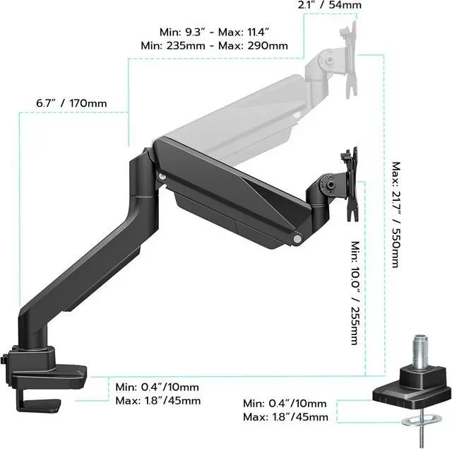 Installed in 3 Simple Steps Quick setup with all hardware included. 1. Mount the arm using the C-clamp or grommet base. 2. Attach your monitor to the VESA plate (use an adapter if needed). 3. Adjust tension with the + or screw until the arm holds your monitor in the desired position