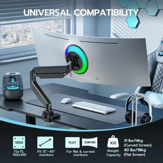 Versatile Installation for Every Workspace Fits 13" -49" screens and supports up to 40 lbs (18 kg) per monitor or 31 lbs (14 kg) for curved ones. Fully VESA compatible (75x75, 100x100), it offers clamp or grommet installation for desktops 1045 mm thick. Compatible with Samsung G9 (new version only)